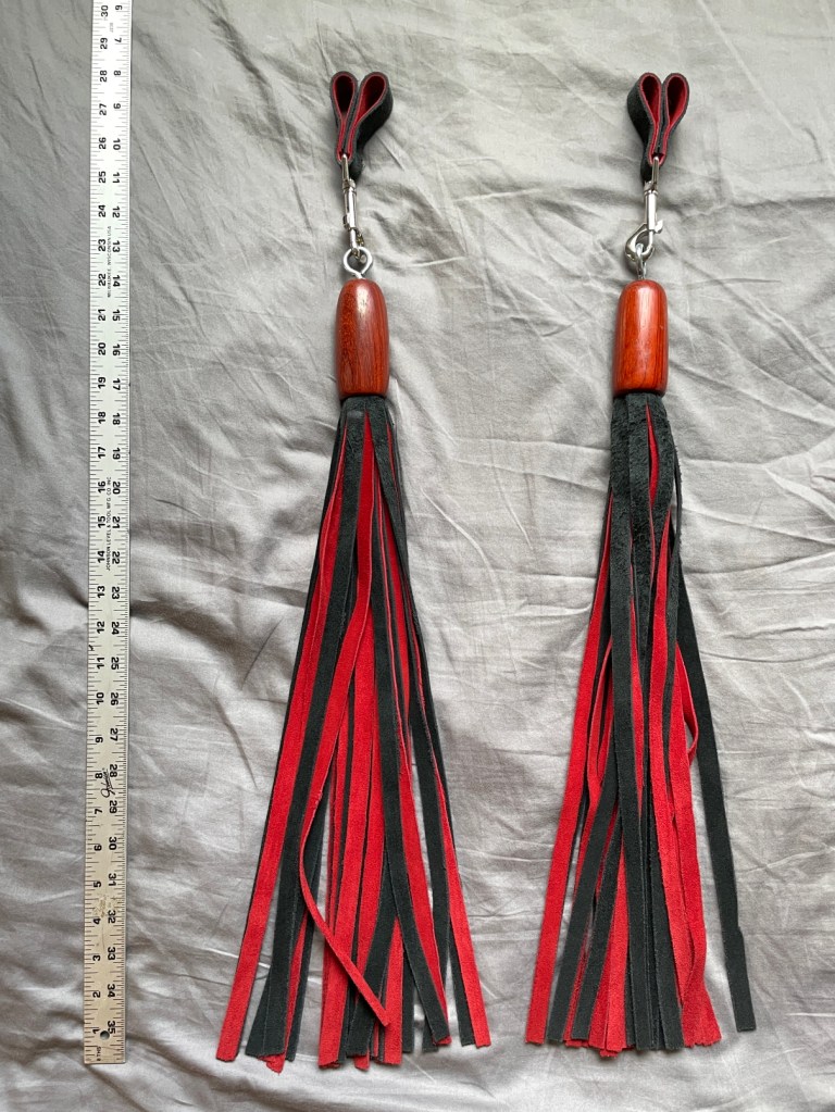 Matching floggers, each with 30 tails. Tails are 19″ long and made of 1/2″-wide untreated brushed suede. The handles are padauk wood and slightly different in shape, as they are hand-carved, but both floggers are the same overall weight. Total length is 29″. These are heavy and pack quite the punch. They have only been lightly used. $140 for the pair (originally purchased from HC Fantasies for $200).