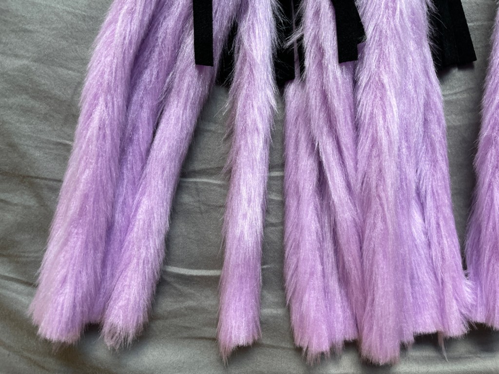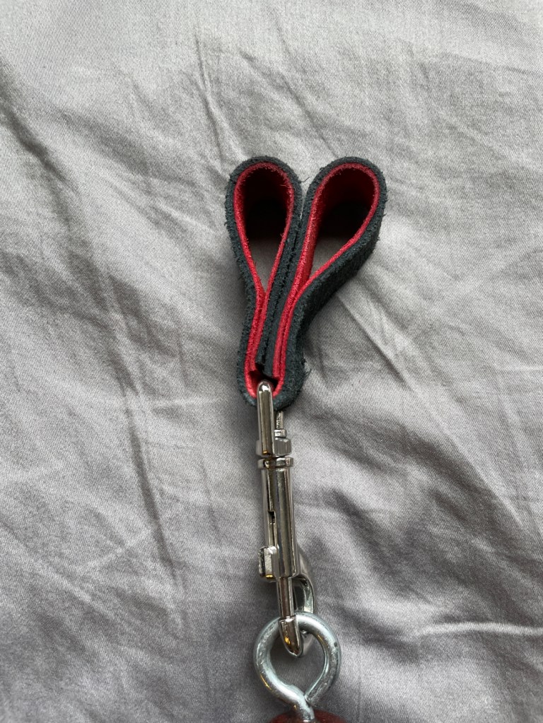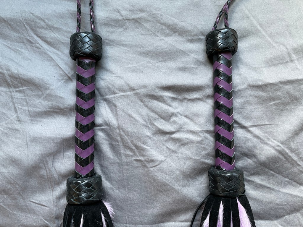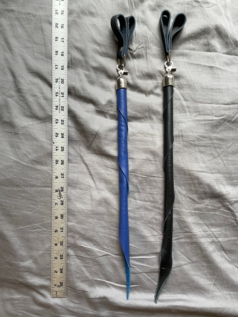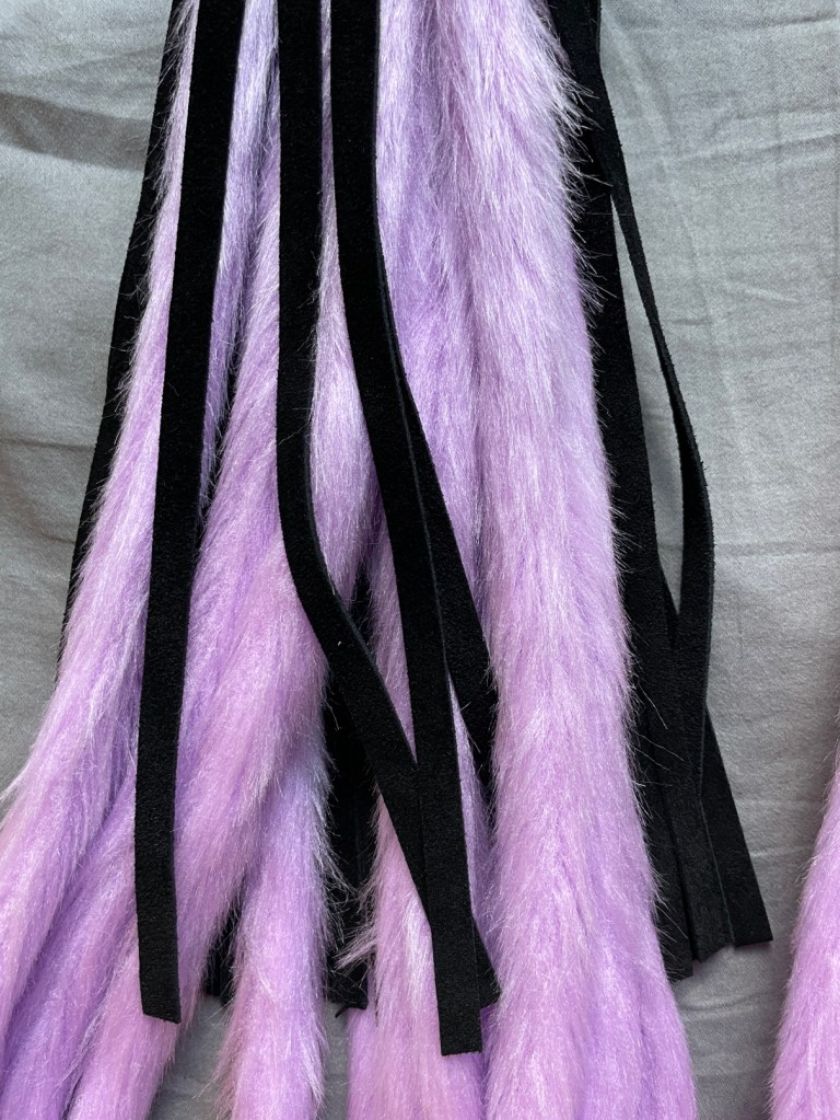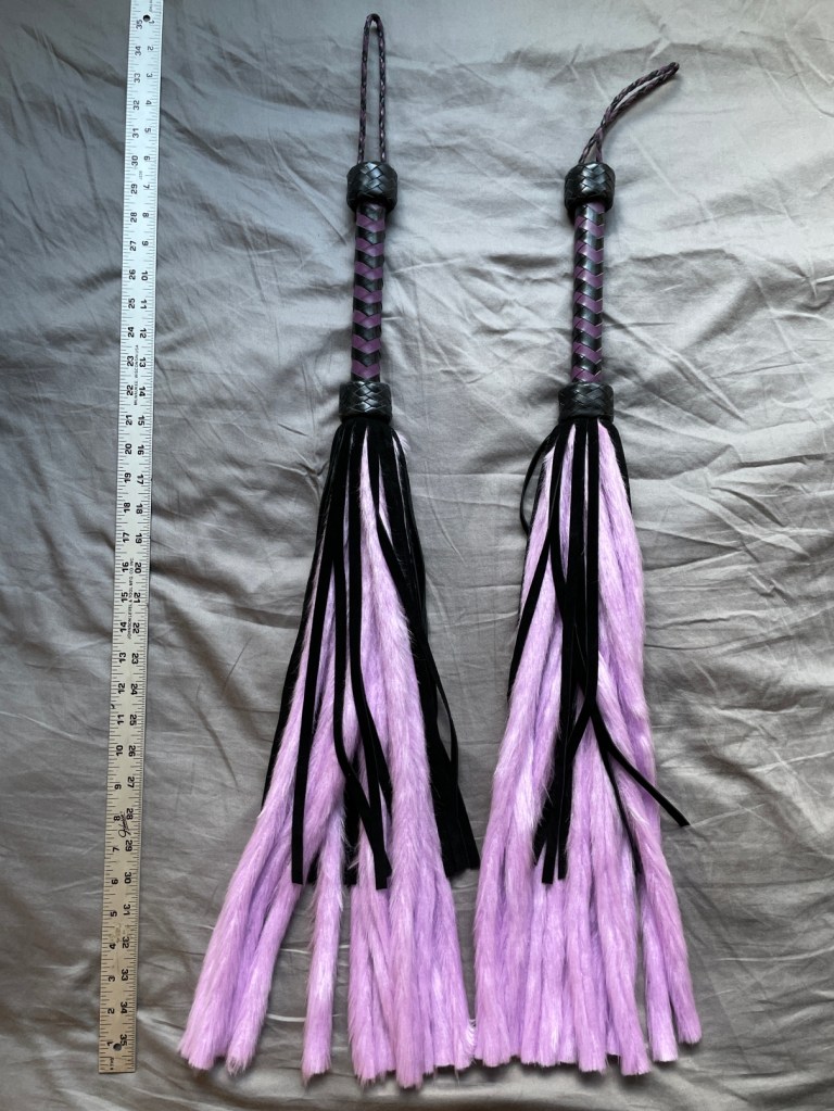 Flogger has 24 suede tails on the outside and 12 synthetic fur tails on the inside. Tails are 21″ long. Handle is woven leather and 9″ long. I cut the suede tails slightly shorter, so that I can deliver different sensations depending on how deep I throw the flogger. These have never been used, as I’ve found my style to lean towards the more intense. $15 each, or $25 for the pair (originally purchased from Amazon for $25 each).
